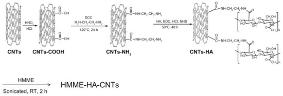 Scheme of the preparation of Hematoporphyrin MonoMethyl Ether Hyaluronic Acid Carbon Nanotubes (HMME-HA-CNTs). Reproduced from [122]. Copyright 2013 Dove Medical Press Ltd.
