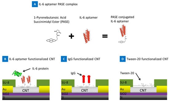 Schematic showing the reaction of 1-Pyrenebutanoic Acid Succinimidyl Ester (PASE) onto IL-6 aptamer forming the IL-6 aptamer PASE complex. Three groups of devices were prepared, Carbon Nanotube (CNT) device functionalized with (B) IL-6 aptamer PASE complex, positive control; (C) IgG, negative control; and (D) tween-20 blocking agent, negative control.