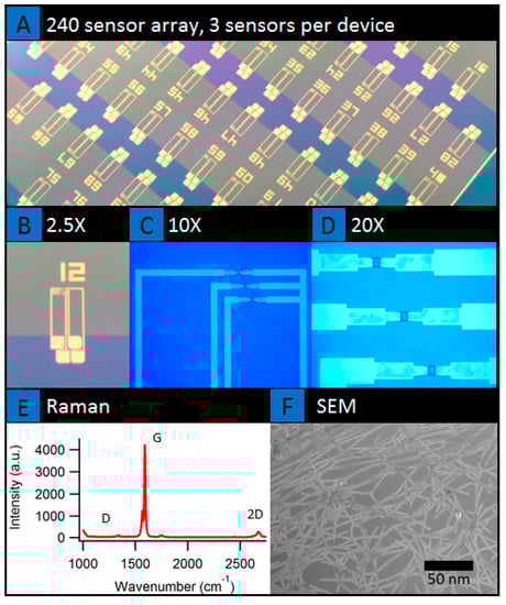 (A–D) Device characterization showing optical images of the sensor array platform at different magnification, (E,F) Raman characterization, and SEM (Scanning Electron Microscopy) image of the CNT film imbedded within the sensors respectively.