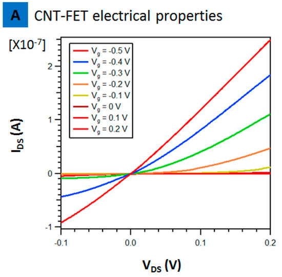 Figure 4 presents the characteristics of a single array, CNT-FET, in buffer solution. The source to drain current (IDS) versus source to drain voltage (VDS) at different gate voltages is presented in Figure 4. The source to drain current decreased with increasing positive gate voltage. This suggests the device works as a p-type semiconductor in 1× PBS. No leakage was seen as at positive voltage the current is almost zero suggesting superior p-type transistor compared to past reports where there was still a significant drain current at zero and increasingly positive gate voltage [17]. This CNT-FET is also definitely superior compared to past reports on using CNT-FET with antibody fragments that used a mixture of metallic and semiconducting nanotubes resulting in poor on/off ratios [16]. This point is important and needs to be emphasized as the whole sensing principle relies on the charge introduced at the nanotube channels either reducing or increasing the conductance with introduction of IL-6 protein. Leakage currents or poor on/off ratios can thus affect the sensing reliability if one needs to detect such ultra-low concentrations. Thus, at Vg = 0 V, the increase or decrease in conductance with introduction of protein is the result of binding alone and not the result of the currents in the substrate.