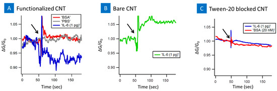 Sensor response of the CNT-biosensor at source-drain bias of 0.1 V and at the gate bias of 0 V. (A) indicates the response after the introduction of 20 nM BSA (red line), 1 mM MgCL2 1× PBS (gray line), 1 pg IL-6 target protein (blue line) to functionalized CNT-biosensor and (B) 1 pg IL-6 target protein to bare unfunctionalized CNT-biosensor (green line); (C) Response of tween-20 blocked CNT-biosensor to IL-6 protein (blue line), and BSA (red line). Arrow indicates the point of sample injection.