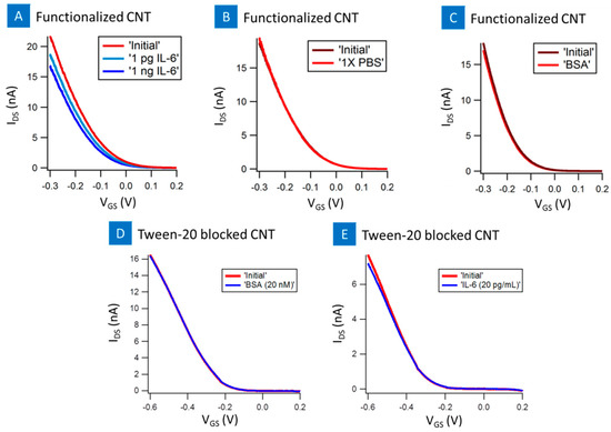 Before and after IDS-VGS characterization of IL-6 aptamer functionalized CNT-biosensor with (A) blank 1 mM MgCL2 1× PBS samples; (B) 20 nM BSA; and (C) 1 pg and 1 ng IL-6 protein injection. IDS-VGS response of tween-20 blocked CNT-biosensor to BSA (D); and IL-6 protein (E).