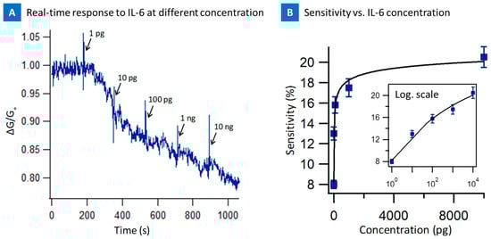 (A) Time dependence of normalized source-drain current of the CNT-biosensor at the source-drain bias of 0.1 V and at gate bias of 0 V after the introduction of IL-6 target protein at various concentrations onto the IL-6 aptamer functionalized CNT-biosensor. Arrows indicate the points of IL-6 target protein injection; (B) The Sensitivity of IL-6 aptamer CNT-biosensor as a function of IL-6 protein concentration (1 pg to 10 ng /mL). The inner box demonstrates the data in logarithmic scale.