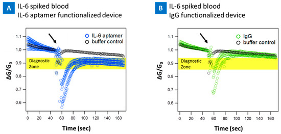 Blood experiment results. Response of the CNT-biosensor at source-drain bias of 0.1 V and at the gate bias of 0 V. IL-6 spiked blood samples were tested on two different CNT-biosensor surfaces, IL-6 aptamer (A), and IgG (B) functionalized surfaces. The response of the IL-6 aptamer functionalized devices to control buffer, 1 mM MgCl2 1× PBS, is presented in each panel as a reference point (black marks). (A) Shows the respond of the IL-6 aptamer functionalized device to IL-6 protein spiked blood (10 pg/mL), ~8–13% drop in the current (diagnostic zone); (B) Presents the response to IgG functionalized CNT-biosensor, negative control surface, to IL-6 spiked blood showing no significant change in signal. Arrows indicate the points of IL-6 spiked blood injection, at 60 s.