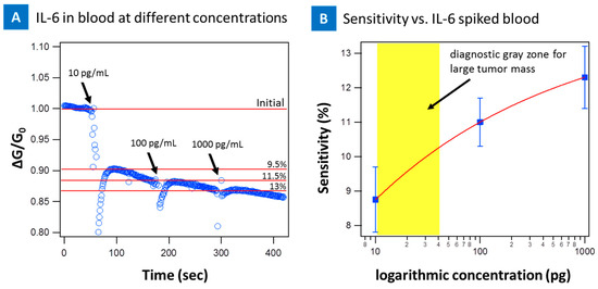 (A) Time dependence of normalized source-drain current of the CNT-biosensor at the source-drain bias of 0.1 V and at gate bias of 0 V after the introduction of IL-6 spiked blood sample at various concentrations onto the IL-6 aptamer functionalized CNT-biosensor. Arrows indicate the points of IL-6 spiked blood injection; (B) The Sensitivity of IL-6 aptamer CNT-biosensor as a function of IL-6 protein concentration in blood sample (10 pg to 1 ng /mL) in logarithmic scale. Diagnostic gray zone for large tumor mass at ~12–40 pg/mL is highlighted in yellow which is higher than our sensor’s lower limit sensing threshold at 10 pg/mL.