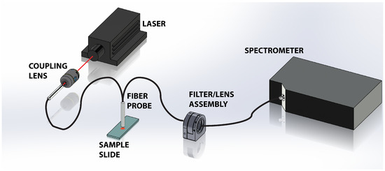 Figure 1 shows a schematic of the experimental apparatus. A 300 mW, 785 nm near-infrared laser (LaserGlow, Toronto, ON, Canada) is used to illuminate the tissue sample. To prevent saturation of the spectrometer with strong residual Rayleigh signal, the beam was attenuated and coupled into a multimode optical fiber reflection probe (Ocean Optics, Dunedin, FL, USA) through a 10× objective (coupling lens, ThorLabs, Newton, NJ, USA). The attenuation and coupling losses resulted in approximately 1 mW of power emerging from the fiber probe. The probe, comprised of a read out core surrounded by a ring of 200 m diameter core illumination fiber, was positioned approximately 1 mm above the sample. The divergence of the light emanating from the probe illuminates the tissue sample with a spot that is approximately 700 m on the tissue, which is a significant fraction of the tissues under study. This results in spatial averaging of the Raman scattering signal collected by the probe. The scattered light is collected via the central read fiber and is transmitted through the second leg of the probe to the filter assembly. The emerging light enters the filter/lens assembly where it is collimated and passes through a 785 nm Raman edge filter (Edmund Optics, Barrington, NJ, USA) which is designed to block the laser and elastic scattering while transmitting light greater than 792.5 nm. The filtered light is then focused back into an optical fiber and directed to a Maya Pro 2000 NIR spectrometer (Ocean Optics). The light is then dispersed across the detector and recorded to a computer for further analysis.