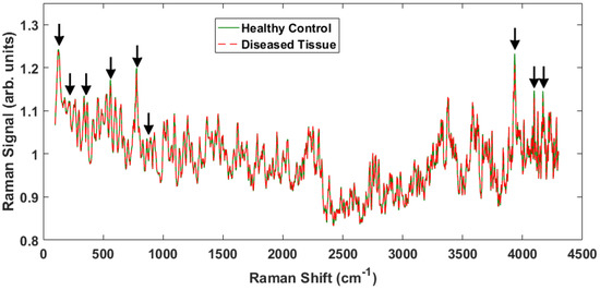 There are some notable differences in the two spectra that enable discrimination between the healthy and malignant tissue samples. The Raman peaks that played a key role in separating the tissue classes are marked with arrows in Figure 2. Some of the marked peaks have been identified in the literature. Notably, within the conventional fingerprint region (400 –1800 ), the band at 500 is associated with glycogen, and the peak at 780 is due to nucleic acids, specifically the nucleobase adenine [8,14,25,26]. Note that the specific locations of the Raman shifts will vary slightly depending on the local environment (e.g., water content). The high frequency and low frequency peaks have not been identified, but are actually observed to undergo larger intensity changes and therefore provide greater discriminatory capability.
