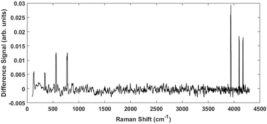 To accentuate the variations in the observed Raman spectra from the different tissue sample classes, a representative difference spectrum was generated from the two spectra presented in Figure 2. Figure 3 shows the result. There is a general suppression across the entire Raman shift spectrum (i.e., the normalized healthy tissue samples show slightly greater intensity across the spectrum consistent with previous measurements on adenocarcinoma [27]), but more importantly the differences of the discriminatory peaks are more noticeable. The two distinct lower frequency peaks at 130 and 350 as well as a broad peak near 200 are of interest because they are previously unreported, lie close to the fingerprint region, and proved useful in our statistical analysis. We will return to these peaks later. In addition, smaller, less distinctive differences are observed at 870 and 940 , which have been previously reported as arising from Tryptophan and C–C stretching, respectively [28].