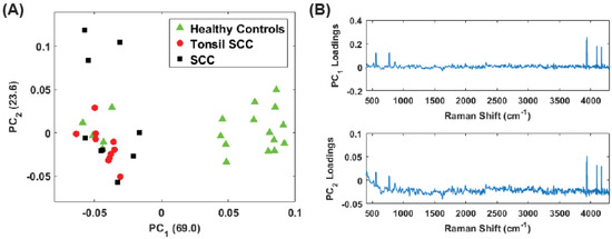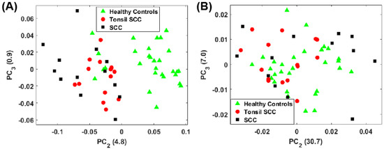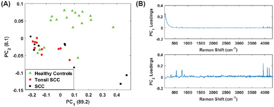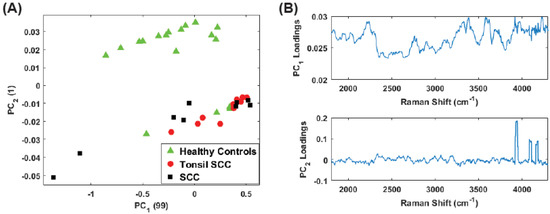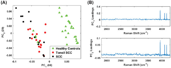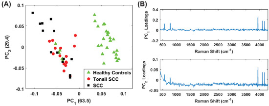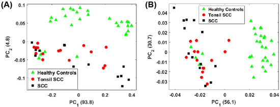 Plot of the first two principal component scores for (A) for the full spectrum (100 –4300 ) and (B) the conventional fingerprint (400 –1800 ). Both plots show good separation between the healthy controls and the malignant tissue samples (both tonsil squamous cell carcinoma and squamous cell carcinoma). The numbers in parentheses represent the information content associated with each principal component.