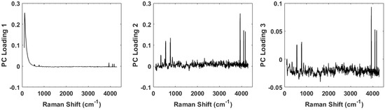 Plots of the loadings for the first three principal components. The loadings for the first is dominated by a large Rayleigh peak near the 0 shift, but small peaks can be seen further out. The loadings for the second and third principal components clearly show the peaks and contribute strongly to the discrimination capability of the spectra.
