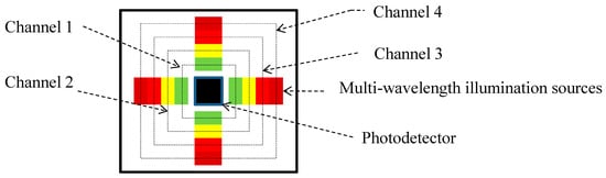 An OEPS (physical size: 18 mm × 18 mm × 0.1 mm), as shown in Figure 2, consisted of (1) 16 light-emitting diodes (LEDs, JMSIENNA Co., Ltd., TouFen, Taiwan) as illumination sources []. Their peak wavelengths were 525 nm (green), 590 nm (yellow), 650 nm (red) and 870 nm (IR) respectively, and (2) A Si-photodiode (PD) with a large active area (1.69 mm2, S10625, Hamamatsu photonics K. K., Hamamatsu City, Japan) as a photodetector. The PD and LEDs were mounted side-by-side (reflection mode PPG). The PCB routing and footprints were allocated by PADS (Pads PCB PADS Standard, Wilsonville, OR, USA). A layer of clear epoxy medical adhesive was also used to protect the optical components.