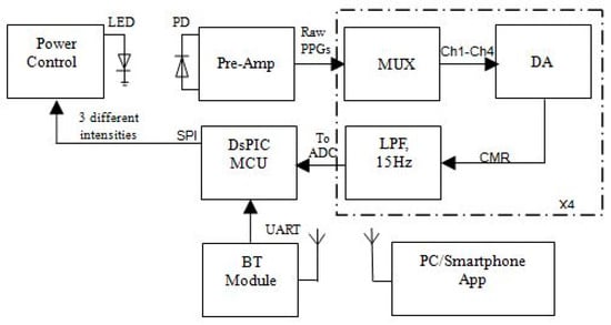 Since an alternative component (AC) is 2–5% of the static component DC [], thus the raw signal from the PD needs to be amplified by the Pre-Amp. The MUX is also used as a demultiplexer, as the output of the PD is a pulse train of multi-wavelength illuminations. The common mode rejection of the differential amplifier (DA) is driven to a LPF to eliminate a high frequency (HF), such as power supply frequency and electromagnetic. In addition, the LPF is playing an important role for preventing the aliasing components from being sampled. Then the signal from the LPF is moved to the DsPIC processor, and is then converted to a digital form through an analogue-to-digital convert (ADC). The wireless transmission is achieved by a Bluetooth module that receives the digital PPG signals from the central processor, through the USART protocol, to then send the signals to a PC and/or a smartphone device.