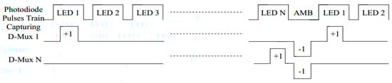 On the other hand, the switching time between these illumination sources is crucial to distinguish between different LED wavelengths, otherwise the PD produces only interference pulse trains with a combination of multi-wavelength illuminations. The output of PD requires demultiplexing where one specific wavelength illumination is extracted from these combined signals at a certain time. After cancelling the effect of ambient light and common mode rejection, the signals from these individual LED illuminations are acquired respectively and passed through a LPF (fc = 15 Hz) where they are converted to digital signals inside the DsPIC processor.