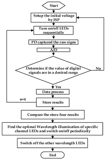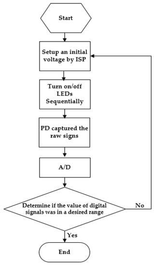 For the OEPS to work accurately under different conditions, it is necessary to optimize the desired signal level and/or the thresholds as shown in Figure 5. While the system is initialized, the LED voltage is powered by the microcontroller through an interface serial port (ISP), and then a series of time switch for multiplexing LED illuminations is established. The raw signal is captured by the PD to be then converted to a digital signal via ADC. The output of the analog signal circuit is connected to the ADC channel of the dsPIC. One ADC sample is taken during each LED’s ON-time period, the adjust DAC values change accordingly to calibrate the LED intensity and keep the output signal level within the microcontroller’s ADC range. Finally, an optimal value between the thresholds of saturated and digital outputs is chosen. Once the value is set to a desired range, the programmed loop is ended and sets the value as an output voltage of LEDs. Otherwise, the voltage flowchart is repeated till the desired value is attained.