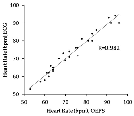 The evaluation of the HR readings between two measurement techniques, i.e., OEPS and three-lead resting ECG (AT-10 Plus, Schiller UK Ltd., Bellshill, UK) were performed using unpaired t-test. Pearson’s correlation analysis was also used to correlate quantitative variables (r ≥ 0.98), as an indicator of two techniques evolving in parallel, as shown in Figure 7. The test showed that there was no significant difference since there is a probability value of (p = 0.99) with a condition of (p < 0.05).