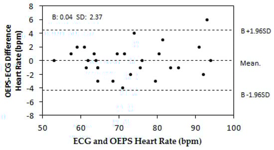 The Bland–Altman method was used to compare the values of the HR obtained between the OEPS and the commercial ECG devices. Figure 8 indicates the bias B: 0.04 bpm, standard deviation SD = 2.37 bpm, lower and upper limits of agreement, −4.60 bpm and +4.68 bpm respectively.