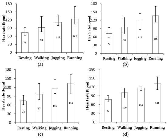 HR measurement results of different skin types at four types of exercises, i.e., resting, walking, jogging and running. (a) Mean HR and range (skin type I & II); (b) Mean HR and range (skin type III); (c) Mean HR and range (skin type IV); (d) Mean HR and range (skin type V).