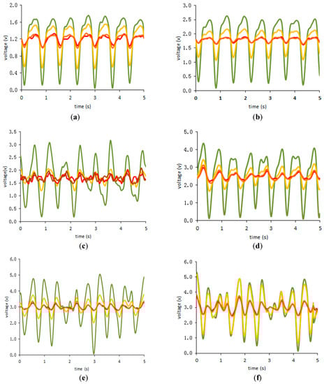 Referring to the auto adaption effect shown in Figure 10a–f, the intensities of the PPG signals appear to be higher with the auto gain applied compared to those without the auto gain. As depicted in Figure 10, the auto gain is able to improve the quality of the signal-to-noise ratio (SNR) resulting in more precise and easy-to-obtain HR measurements. Meanwhile, starting from the resting exercise to the jogging one, the intensities of the PPG signals became higher over time. As the intensity of the physical activity in the jogging exercise increased, the intensity of the PPG signals corresponding to the illuminations of yellow, red and infrared LEDs was also increased significantly, whilst the intensity of the PPG signals from the green illumination remained stable. However, the motion artifact occurred predominantly with the increase of the physical activity resulting in imprecise HR measurements contrary to resting or moderate activity.