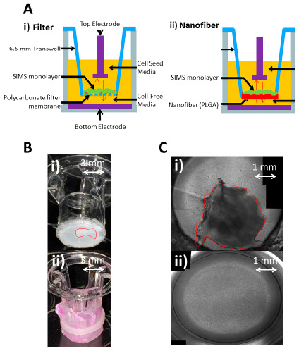 (A) Cross-sectional diagrams: (i) Filter-based assembly uses manufactured polycarbonate (PC) filter membrane to support submandibular immortalized mouse salivary (SIMS) epithelial cell monolayer formation, (ii) Nanofiber Transwell, made by excising the filter with a scalpel and securing nanofibers to the base; (B) Perspective view of nanofibers added to Transwell inserts by removing the filter membrane with a scalpel: (i) re-attaching with acrylic glue, red outline depicts delaminated nanofibers from the underlying Whatman membrane, (ii) Nanofiber fastening with elastic band; (C) 10× optical image top down: (i) using acrylic glue to secure nanofiber, red outline indicates delaminated nanofibers, (ii) using elastic band, fiber integrity is maintained. Band tension provides the ideal combination of force and slippage to support fiber hydration and cell culture.