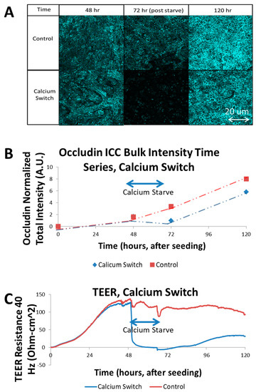 Calcium Switch Experiment trans-epithelial electrical resistance (TEER) vs. intra-class correlation (ICC): (A) Chart of immunofluorescence images, generated from maximum projections of Z-stacks of occludin-stained SIMS monolayers on PC membranes extracted from Transwells. Samples were fixed at 48, 72, 120 h. Final (120 h) time point showed greater intensity in control, likely due to continued cellular growth not subject to calcium starvation; (B) Graph of total intensity sum (using ImageJ RawInt) of each image, charted with respect to time. Calcium switch occurs at 48–72 h. Intensity rises continuously in control condition, while it is reduced, but then recovers in calcium switch condition; (C) Graph of TEER resistance, measured at 40 Hz, in units of Ohm-cm2 to normalize for membrane area, although all samples in this study used 0.33 cm2 of membrane area per well. Calcium switch drastically reduced TEER signal, which recovered partially after renewing calcium to media.