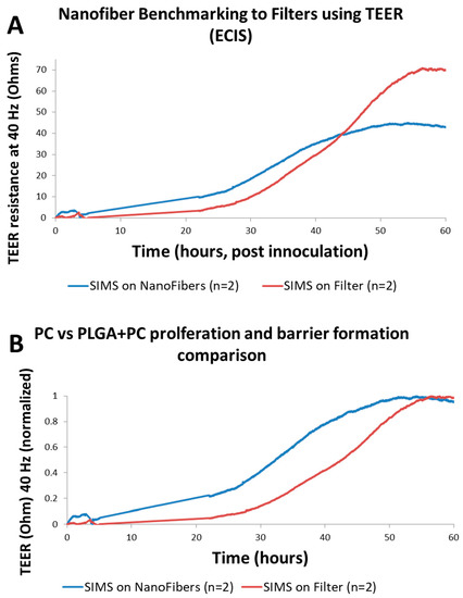 In order to test the functionality of the scaffold Transwells, TEER measurements were taken during a time course cell growth experiment with SIMS cells. The test wells contained PLGA nanofiber mats, with PC 10 μm thick, 0.4 μm pore size cell filter membranes underneath, while the control wells contained only a PC filter membrane. The active wells were seeded with 100,000 SIMS cells per well and immediately placed into the ECIS system within the incubator at 37 °C to begin the experiment. Control wells were not seeded with cells, but filled with fresh SIMS media to account for signal drift and external factors. The impedance at several frequencies between 40 Hz and 50,000 Hz was collected continuously and individually for each well. The frequency used to calculate the TEER was the lowest available one, usually 40 Hz [11]. The barrier function was most pronounced in the resistance data at lower frequencies because the time for charged ions in solution to diffuse across the cell membrane was longer, giving them adequate time to locate the path of least resistance, which was the paracellular pathway between cells and not through the cells themselves. At higher frequencies, the ions were not given as much time and travelled directly through cell membranes more often reducing the selectivity of the signal [1,11].