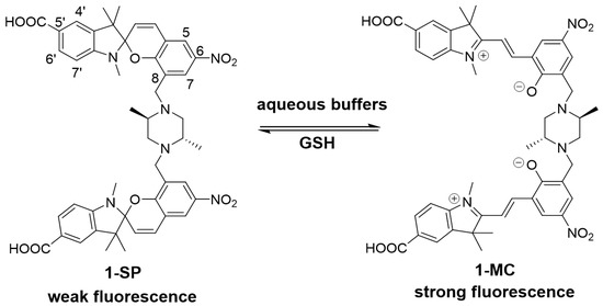 A 6-nitro substituent was incorporated onto the component spiropyrans of 1 to promote the formation of the MC isomer under aqueous conditions [30,35]. In addition, a more sterically demanding dimethyl-piperazine core was incorporated into the design to suppress non-covalent binding of GSH to the MC isomer as was proposed for the literature spiropyran-based ‘turn on’ sensor [26]. Finally, a 5′-carboxylate group was introduced to enhance hydrophilicity to further improve aqueous solubility and compatibility over the earlier sensor [28].