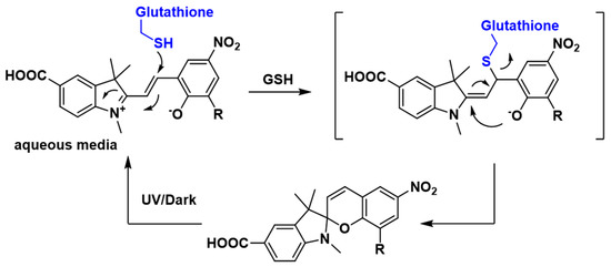 Next, the reversibility of the sensor was studied in the presence of 5 mM GSH to ascertain if GSH binding and release can be controlled and defined by measuring the state-dependent absorbance. The addition of GSH to the DMSO/water solution of sensor 1 resulted in a decrease in absorbance in the above-mentioned 512–522 nm region (Figure 3C). This is consistent with the formation of the SP isomer, possibly by a conjugate addition of GSH to 1-MC followed by cyclisation, as outlined in Figure 4. GSH is known to undergo conjugate addition, and this has been used as the basis of a number of sensors [11,13,37]. The solution was irradiated with UV light (λ = 365 nm) to switch the sensor back to the more colored MC isomer, with a re-appearance of the absorption in the region of 512–522 nm. Repeated switching between the SP and MC isomer with light of specific wavelength produced reproducible changes in absorbance intensities (see Figure 5A), which demonstrates that sensor 1 can be used for multiple measurements of GSH.