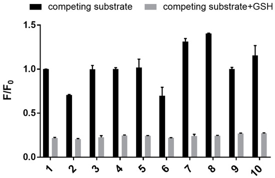 Bar graph showing fluorescence of 1 (50 µM) in the presence of a range of biologically relevant substrates: 1. blank; 2. glutathione disulfide (GSSG); 3. Cys; 4. Asp; 5. Glu; 6. 2-mecaptoethanol (BME); 7. Na+; 8. K+; 9. Ca2+; 10. Zn2+. Bars represent the fluorescence response with added GSH and/or substrates (F) over the response in the absence of added substrate and GSH (F0). Black bars represent samples in the absence of GSH and with added competing substrate; grey bars represent samples with both competing substrate and GSH. Excitation wavelength = 532 nm, emission wavelength = 650 nm.