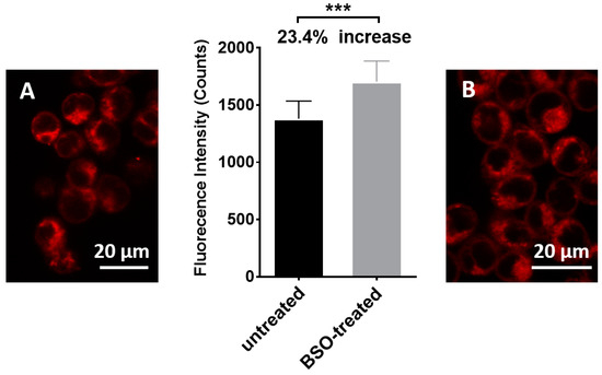 Relative fluorescence intensity of untreated cells and BSO treated cells. The fluorescence of nine small random areas in a cell image were measured for each treatment using ImageJ Fiji. Unpaired student t-test was used with p < 0.05 (***). (A): confocal microscopic image of HEK293 cells incubated with 1; (B): confocal microscopic image of HEK293 cells pre-treated with BSO and incubated with 1.