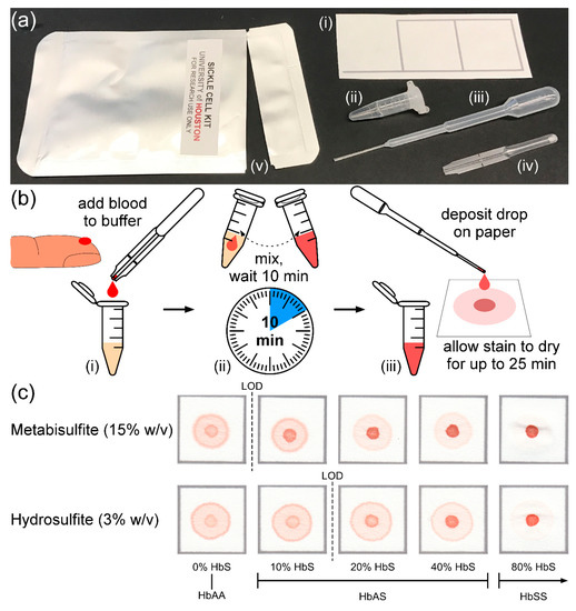 Overview of the distributable paper-based SCA diagnostic test kit. (a) Photograph of the sickle cell kit with all components necessary to perform the test: (i) patterned chromatography paper; (ii) reagent tube containing reagents; (iii) reagent dropper; (iv) blood dropper; and (v) foil pouch. (b) Schematic illustration showing the steps required to perform the paper-based test: (i) ~20 μL of whole blood is collected via finger-stick using the blood dropper and deposited in the reagent tube; (ii) the blood is mixed with a preset volume of buffer (containing either sodium hydrosulfite or sodium metabisulfite) via manual agitation; and (iii) after 10 min, a drop (~20 μL) of the mixture is deposited on the chromatography paper using the reagent dropper and allowed to dry for up to 25 min before being evaluated visually. (c) Representative bloodstains produced by the metabisulfite (top) and hydrosulfite (bottom) versions of the paper-based test for samples with various sickle hemoglobin (HbS) concentrations. The limit of detection (LOD) for each version is indicated by a dashed line. Typical HbS concentration ranges for adults and children older than six months of age with different genotypes (normal—HbAA; SCT—HbAS; SCA—HbSS) are marked below the stains.