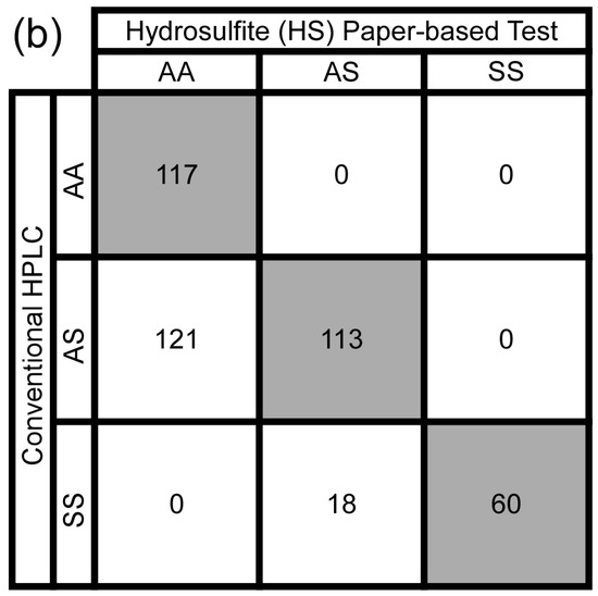 Diagnostic accuracy of the paper-based SCA screening test kit. (a) Aggregate confusion matrix for screening of blood samples (n = 185) with characteristic HbS concentrations via visual interpretation (inexperienced users; n = 3) of the blood stains produced on paper by the metabisulfite (MS) formulation of the test (185 samples × 3 users = 555 total scores). (b) Aggregate confusion matrix for the screening of blood samples (n = 143) with characteristic HbS concentrations via visual interpretation (inexperienced users; n = 3) of the blood stains produced on paper by the hydrosulfite (HS) formulation of the test (143 samples × 3 users = 429 total scores). Rows correspond to characteristic genotypes (based on HbS concentration measured using conventional high-performance liquid chromatography—HPLC) and columns correspond to predicted genotypes (diagnosed by the paper-based test). Shaded cells contain the numbers of correct diagnoses.