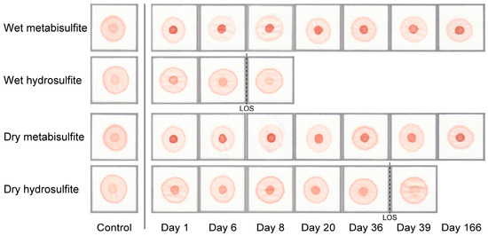 Representative images of blood stains demonstrating the reagent stability of the metabisulfite (MS) and hydrosulfite (HS) formulations of the paper-based SCA screening test under wet and dry storage conditions. (left) Blood stain images for samples with 0% HbS (control) produced by the MS and HS versions of the test using freshly prepared reagents. (right) Blood stain images for samples with 20% HbS (limit of detection of HS version of test) produced by the MS and HS versions of the test using reagents stored under wet (MS powder mixed with aqueous buffer components before storage) or dry (MS powder stored separately from aqueous buffer components) conditions. The limit of stability (LOS)—i.e., the maximum amount of time reagents can be stored before the difference in pattern between samples with 0% HbS and samples with HbS concentrations greater than, or equal to, the limit of detection of tests performed using fresh reagents becomes statistically insignificant—is indicated by a dashed line.