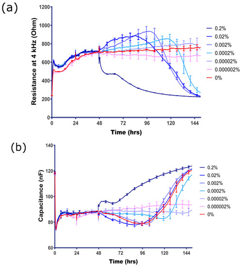 Direct assessment of sodium azide concentration response on BEC. (a) The resistance of BEC measured at 4 kHz represents the barrier integrity; (b) the electrode capacitance of BEC is inversely related to the surface coverage of the electrode by the endothelial cells. Final concentration of sodium azide (range 0–0.000002%) is shown in the colour-coded figure key. Note that the control media-only treatment is the red curve, which shows a very stable barrier for the duration of the time course. These data show mean ± SEM (n = 4 wells) and are representative of at least five independent observations.