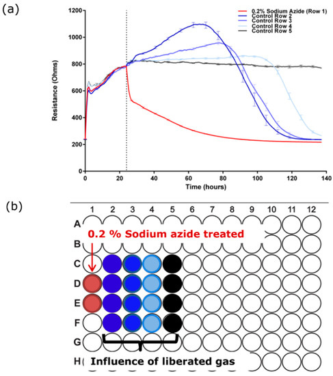 Sodium azide forms a gaseous product which also destroys the barrier integrity of the BECs. (a) Sodium azide (0.2%) was added to the far left wells of an ECIS 96 well plate and control media was added to the rest of the plate. Gaseous liberation affects cells 3 wells distal to the site of addition; (b) plate map shows location of treated wells relative to data in (a). These data have been replicated independently at least six times.