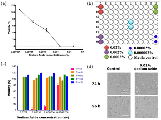The viability of BECs is affected by both sodium azide and its gaseous product. (a) Measurement of sodium azide toxicity measured using cellular adenosine triphosphate (ATP) levels to measure cellular viability. Vehicle-treated cells represent 100%. Viability was measured 96 h after exposure to the sodium azide. (b) Plate map shows the position of the sodium azide-treated wells. (c) ATPlite assay reveals the toxic effect of the gaseous product produced from the sodium azide on the cells in the wells neighbouring the directly treated wells at 120 h. One Sample T tests show that cells 1 well away are significantly affected by the gaseous toxicity (* p < 0.0001). (d) Bright field images of hCMVECs 72 h (top panels) and 96 h (bottom panels) post-treatment with 0.02% sodium azide (right panels) or media only (left panels). Data shows mean ± SEM of two wells from of a single experiment, which is representative of three independent observations.