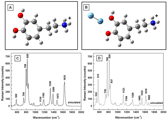 The effect of a SERS environment on the Raman vibrational frequencies of dopaminequinone and neutral DA0 is further analyzed from theoretical and experimental perspectives in Figure 3A–D. The structural representations of the analyte in the proximity of silver after energy optimization using an LanL2DZ basic set that takes into consideration the pseudopotentials for metal atoms are shown in Figure 3A,B. A comparison of the estimated Raman frequencies of dopaminequinone and the Raman results that were obtained experimentally, which are presented in Figure 3C, not only shows good agreement, but, more importantly, confirms the disappearance of dominant DA Raman vibrations at 750 cm−1 and 795 cm−1, in both the simulation and the experimental data. However, this disappearance does not occur for the calculated vibrational lines of neutral DA0 in the proximity of Ag NPs, as observed in Figure 3D. On the contrary, they are the most intense Raman features seen in this figure, besides two other vibrations around 550 cm−1 and 580 cm−1. The stronger interaction of the dopaminequinonic form with silver could be attributed to a somewhat greater electronegativity of oxygen atoms in this configuration than in DA0. Dominant Raman vibrations around 1360 cm−1 and 1510 cm−1 are observed in Figure 3C for dopaminequinone interaction with Ag NPs.
