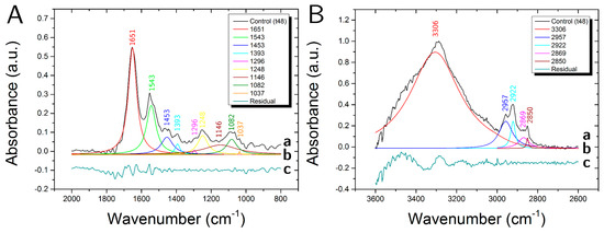Average spectra of not exposed sample (A, (a)) in the range (2000–800 cm−1) and (B, (a)) (3600–2600 cm−1) with (b) deconvolution analysis of peaks with Lorentzian curves and (c) fit residual.