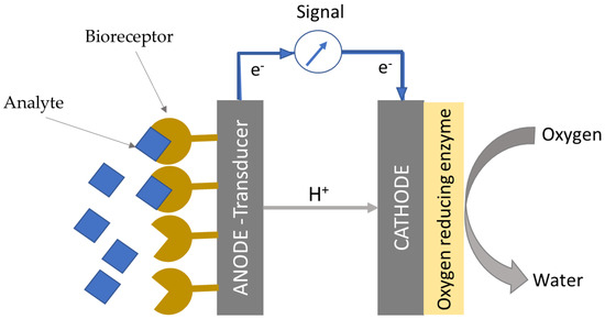 Schematic of an EFC-based biosensor and its detection mechanism. The analyte is detected and oxidised by the bioreceptor, which is usually immobilised at the anode. The electrons released flow across the external circuit to reduce an oxidant, typically oxygen, to water at the cathode.