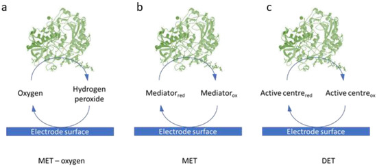 Schematic of the three different electron transfer mechanisms between enzymes and the electrode surface in EFCs: (a) Mediated Electron Transfer by oxygen; (b) Mediated Electron Transfer by electron shuttles and (c) Direct Electron Transfer between the redox centre of the enzyme and the electrode surface.