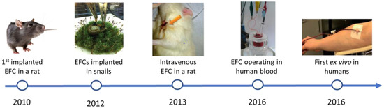 Figure 3 outlines the major successes in the research into implantable EFC since the first implanted EFC reported by Cinquin et al. [38]. On the other hand, Table 2 summarises the characteristics of the principal implanted EFCs reported so far. As shown in Table 2, the highest power outputs were obtained with redox polymer and carbon nanostructures, due to the improved electron transfer they are associated with.