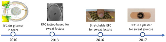 The challenges associated with implantable EFCs has directed the research towards wearable rather than implantable applications, and, consequently, to the exploration of physiological fluids as an alternative to blood, such as saliva, transdermal fluid, sweat, tears, and urine. These fluids are readily available and do not require invasive implantations or blood draws for in vitro testing. One of the major challenges associated with the use of such fluids, is, however, the lower concentration of target analytes with respect to blood. For example, the concentration of glucose in saliva and tears is up to 20-fold lower than in blood [51,52]. Figure 4 shows the progress in wearable EFC achieved so far.