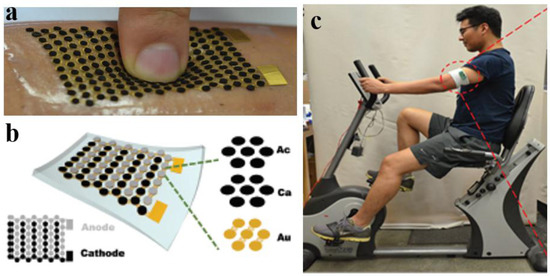 Stretchable EFC for the detection of sweat lactate adapted from reference [55] with permission from the Royal Society of Chemistry: (a) schematic of the design of the EFC based on stretchable polymers showing the different layers made of gold (Au), carbon (Ca) and a recognition element in the bioanode/biocathode (Ac) (b) prototype EFC attached to human skin and (c) EFC monitoring sweat lactate production during exercise.