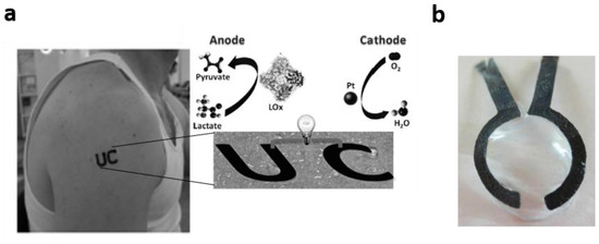 In 2013, an EFC based on a screen-printed tattoo for lactate monitoring in sweat was reported [54]. The EFC tattoo showed exceptional adaptability to the skin and a good mechanical strength sensor, with no signs of inflammation or irritation to the skin (Figure 6a). The EFC tattoo showed good sensitivity to lactate and a clear distinction in current output when tested on subjects with diverse fitness levels. This tattoo-based self-powered sensor was characterized by a considerable half-life of four weeks and could be easily replaced afterwards. Tattoo-based EFCs present an excellent opportunity for skin-worn biosensors, allowing fully integration in the body.
