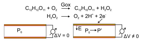 The polarity of dielectric P0 transforms into P′. This polarity change, ΔP = P0 − P′, causes the potential difference of the electrodes (ΔV ≠ 0). Empirically, the amount of current detected is dependent on the potential difference. The potential difference generated depends on the amount of chemical reagent concentration, for both glucose and enzymes. In this case, the concentration charge of the chemical reaction results cause the flow of electric charges that are detected in the form of voltage (V). In other words, the magnitude of the output voltage is proportional to the amount of charge generated from the chemical reaction [].