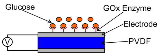 Sensory testing was performed by dripping a glucose solution over a PVDF film coated with the GOx enzyme. The biochemical reaction will occur, resulting in free charge carriers (electrons). A number of free electrons in the PVDF films result in the emergence of a field affecting the polarity of the PVDF films. Consequently, this field causes electrical displacement and produces a potential difference that can be read on I–V meters. The amount of potential read on the I–V meter is influenced by the amount of reactant concentration, including glucose solution and enzyme concentration.