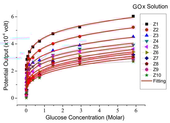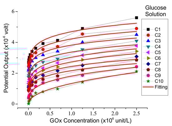 The reaction rate per mole was obtained based on the slope of the graph in Figure 6. Based on the result of the graph curve, the value of each constant could be obtained by matching the value of the sensor output to the glucose concentration for various enzyme concentrations, as listed in Table 3.