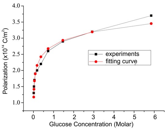 According to Table 4, the value of the electric field (E) arising from various glucose concentrations can be calculated, and the number of dipole moments can be determined. Those quantities were used to obtain the polarization changes in PVDF films, as shown in Figure 7.
