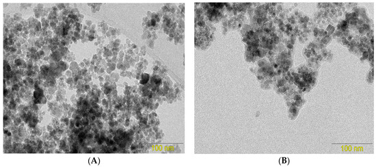 Transmission electron microscopy images of (A) Fe3O4 and (B) CS/Fe3O4.