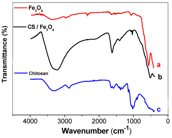 FTIR spectra of (a) Fe3O4, (b) chitosan, and (c) CS/Fe3O4.