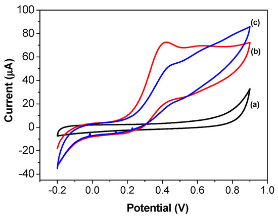 Cyclic voltammograms obtained using the screen-printed carbon electrode modified with AChE/CS/Fe3O4 in (a) 0.1 mol L−1 phosphate buffer solution at pH 7.4; (b) with addition of 20 mmol L−1 ATCh; and (c) with addition of 20 mmol L−1 ATCh plus 1.2 µmol L−1 of malathion.